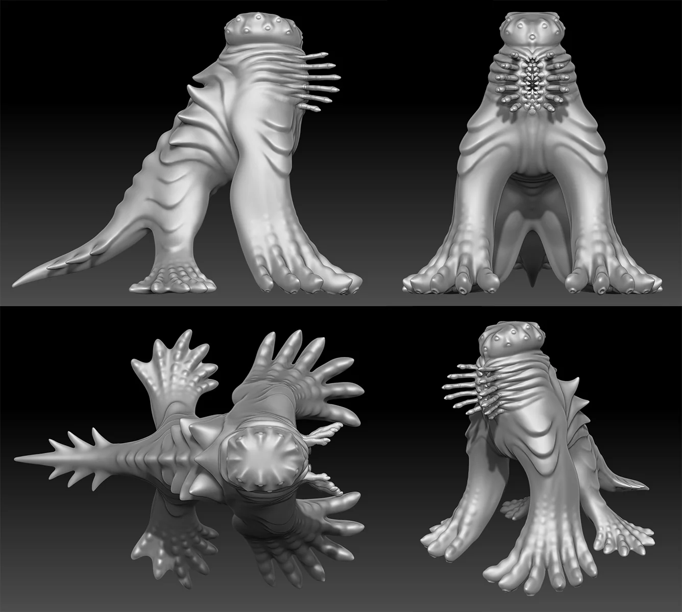"Okay, think of the posture of a gorilla. Not quite a quadruped, but not quite upright... The back limbs are more like a split tail, except there's also a tail. Visualize a sea lion's back end with a tail tacked on. The front limbs have these big appendages that look like fat fingers, but I don't think they're for manipulating. They have suckers on them, so I think they're more for gripping prey. The creature has what I'd have to describe as feeding fingers that fold out from here... and appear to be dexterous enough to act as manipulators. They also direct food into the maw." (228)